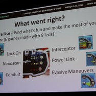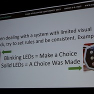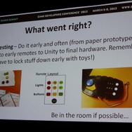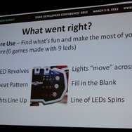 良かった点、悪かった点も紹介されました。まず良かった点としては、プレイテストを繰り返した結果、オンラインとオフラインのUIの統一(9つのLEDでロボットの状態を表現する)がある程度上手くいき、分り易いものが実現できたとのこと。ディスプレイと異なりリアル玩具は表現力が限られるので、この点は重要です。テストは紙上のプロトタイプから動くものまで何度も実施したそうです。また、ゲームを遊ぶ原動力となるストーリーも良いものが出来たと振り返っていました。