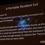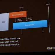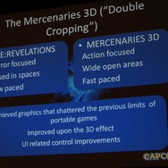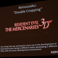 また、同じ耕地で1年に2度の収穫を行う「二毛作」も取り上げられました。本作は『バイオハザード ザ・マーセナリーズ3D』は対になる作品です。まず3DSの基礎研究から始まり、それは両方のゲームがベースとしています。まず開発がスタートしたのは「ザ・マーセナリーズ3D」で、「リベレーションズ」はシナリオの練り込みを行い、後から開始され両方が並行して走るという形になります。先行する「ザ・マーセナリーズ3D」で技術やノウハウの蓄積を進めながら、それを活かすことで「リベレーションズ」の開発にフィードバックします。スタッフも重なる部分が大きかったそうで「スタッフには苦労もありましたが(1本終えたらすぐ次のプロジェクトに)、プロデューサーとしては上手く行ったと思います(笑)」。