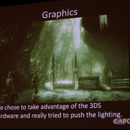 具体的に3DSのハード特製を活かした部分ではライティングが挙げられました。「3DSには利用頻度が高いシェーダーがハードウェアシェーダーとして搭載されていて、家庭用ゲーム機並の表現が可能で、かつプログラマブルシェーダーではないのでGPU負荷も抑えられるという特製があります。ライティングもそうで、リッチに使うことでホラーを強調できました」キャラクターには常時4個のライトが当たっていて、1シーン当たりでは30~40個の光源が使われていて、かつエリアの切り分けでライトデータをエリア毎に分けることで更に多くの光源をコントロールしているそうです。ライティングのお蔭もあり、家庭用ゲーム機に引けを取らないビジュアルになっているのではないでしょうか。