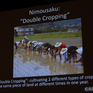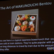 まずは「幕の内弁当」です(Makunouchi-Bentoのスライドは写真に収める参加者多し)。日本の典型的なお弁当のスタイルであり、様々なバラエティに飛んだものを一つの弁当箱の中に詰め込んでいます。「色々な要素を適切にパッケージングするというのは日本人の強みなのではないでしょうか」