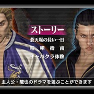体験版は公式サイトで無料配信されているもので、序盤の物語とボス戦がプレイ可能な「ストーリー」、新舞台である大阪・蒼天堀を自由に探索できる「蒼天堀の長い一日」、劇的に進化を遂げた「喧嘩バトル」をプレイしながら学べる「喧嘩指南」、蒼天堀プライムの「美姫」がお相手をしてくれる「キャバクラ体験」と4つのチャプターに分かれています。