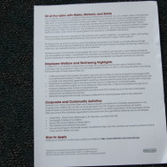 配布されていた資料では福利厚生の充実を謳っていて、社内のフィットネスセンターの利用や外部のフィットネスクラブの会員権の提供、健康診断や専門家によるアドバイス、会社負担によるインフルエンザ予防接種などがあるそうです。また、カーシェアリングサービスのZipcarを無償で利用できるほか交通パスも支給されます。仕事の専門分野における教育も整備されているとのこと。
