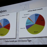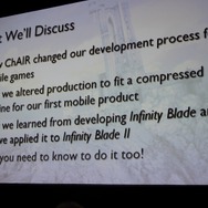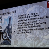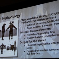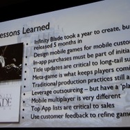 振り返ると『Infinity Blade』で重要だったのは「モバイルのユーザーを知ること」だったそうです。モバイルならではの展開として本作でもアプリ内課金や継続的なアップデートを実施、それにより長くユーザーにプレイしてもらえるものになりました。アップデートを行う度に売上のベースは上がっていったそうです。開発手法については大規模ゲーム開発で培ったものは依然として活きる一方、「プランB」を用意しながら大胆にアウトソーシングを使い外部の協力を得たことが僅か半年の開発期間には必要だったとのこと。
