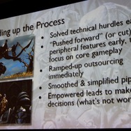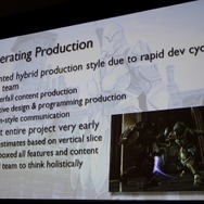 幸いな事に「Unreal Engine 3」自体の経験はあるスタッフが多かったため、3週間でコアなゲームプレイの部分が動くようになり、6週間でバーティカルスライス(一定の部分が実際に遊べるビルド)が完成。それをベースに実現可能なスケジュールを引き直し、更に何が必要で何が不要かチーム全員で議論をしながら要素を削ぎ落していったそうです。その後の進捗は1枚のエクセルファイルで全員で共有、バグについても同様だったそうです。