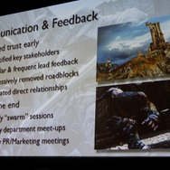 チーム内外のコミュニケーションも円滑化する必要がありました。毎週の「Swarmセッション」は様々なスタッフが集まり、特定の箇所について色々な角度から意見をとにかく出すというもの。あるいはチーム別、PR/マーケティングチームとのミーティングも毎週行われました。また、早い段階からプレイテストを繰り返し、問題点を洗い出すことをしました。これはチーム全員がゲーム内容を明確に理解することにもつながったと言います。
