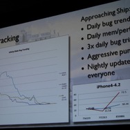 初のiOSかつハードの性能を引き出すような本格ゲームということもあり、QAテストも入念に行われました。Androidに比較すると端末の数が少ないiOSですが「ハードのバージョンだけでなく、インストールされているOSのバージョンとの組み合わせでも引き出せる性能に差があり、あらゆる組み合わせをテストした」そうです。メモリ不足でクラッシュするシーンも当初はあり、最適化には苦労したようです。