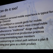 Hurley氏は講演の最後でモバイルゲームに取り組むにあたって最も大事なポイントとして「これがAAAタイトルだとチーム全員が信じて取り組むことです。そうすればモバイルであっても最高のユーザー体験を提供するAAAタイトルがあなたにも作れるはずです」と話し締めくくりました。