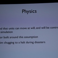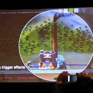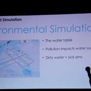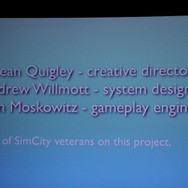 まず登壇したQuigley氏はシンプルに初代と同じ名前で呼ばれる『シムシティ』という最新作に多数のシリーズを支えてきたベテランエンジニアが携わっていると強調しました。ウィル・ライト氏とマクシスが生んだ作品は、ライト氏が同社を離れ、同社もEAの一部門として再編された今もなお当初の志を引き継いでおり、世界の全てをシミュレートするという意思が息づいていることを示唆しました。