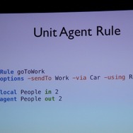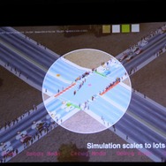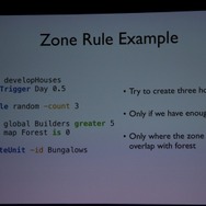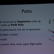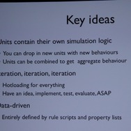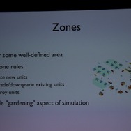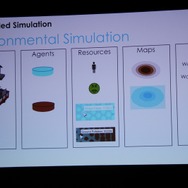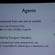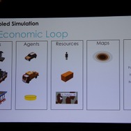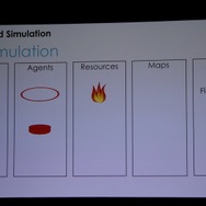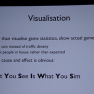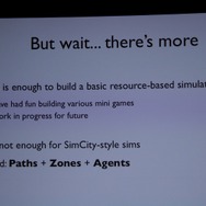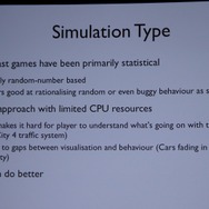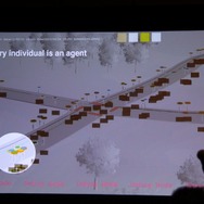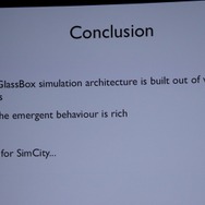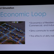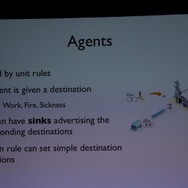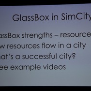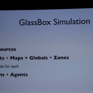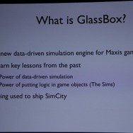 ここからWillmott氏が具体的に「GlassBox」について説明していきます。「GlassBox」はシリーズが培ってきたデータを基にしたシミュレーションと、『ザ・シムズ』シリーズの特徴となってきた個別のオブジェクにロジックが与えられるという2つの考え方を進化させたものになっています。そしてこれは一般的なゲームで使える汎用的なシミュレーションエンジンではなく、『シムシティ』のために作られた、というのも重要なことです。