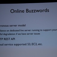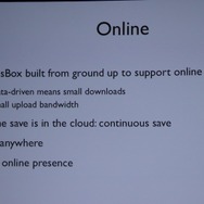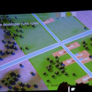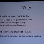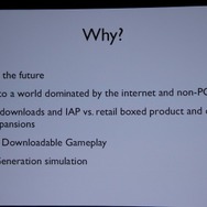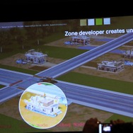 また、新しい時代のゲームに適応しようとする努力が「GlassBox」の開発の原動力になったと言います。深く言及はされませんでしたが、『シムシティ』はPCでネットワークと統合された形になるのは間違いありません。パッケージ+幾つかの拡張版、という過去から決別し、常にアップデータがされる「Downloadable Gameplay」(DLG)を実現するとしました。セーブデータはクラウドに常時保存され、どこでも同じゲームをプレイできるようになるそうです。一方で、常にインターネットに接続されている必要もないとのこと。