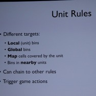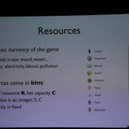 「GlassBox」のシミュレーションのコアとなるのは「リソース + ユニット + マップ + グローバル」という4つの単位とそれに付随する「ルール」です。順を追って説明していきますが、背景としてあるのは乱数表からの決別です。過去のシムシティはプレイヤーの都市設計をベースにしながら乱数、つまりランダムな要素を用いてシミュレーションが行われていました。これは計算能力に限りがある際には仕方ないことですが、プレイヤーにとっては理不尽と取れる結果をもたらす場合もあります。「GlassBox」では冒頭の4+1を使い、データの計算が支配します。