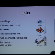 「ユニット」は家や商店、工場などの建物や、シム(人)など世界で何かをする主体になるものを指します。それぞれのユニットはリソースを保有します。例えば工場に水があるかどうか、シムの幸福度などです。