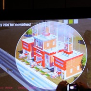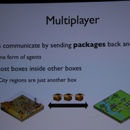 「GlassBox」エンジンではマルチプレイもサポートされます。1人のプレイヤーの街は「ボックス」という単位で呼ばれ、一緒にプレイしているユーザーの「ボックス」と「パッケージ」という単位を相互にやりとりすることで影響を受け合うということです。これは非同期的に行われ、同時にプレイしている必要はありません。