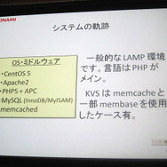 まず廣田氏は「開発環境は一般的なLAMP環境です」と切り出しました。LAMPとはLinux(OS)、Apache HTTP Server(Webサーバ)、MySQL(データベース)、Perl、PHP、Python(スクリプト言語)の頭文字のこと。このうちOSはCentOS 5、WebサーバはApache 2、言語はPHPがメインとなっています。KVS(Key-Valueストア)はmemcashedベースで、一部membasedを使用するケースもあるとのこと。つまり「大規模タイトルといっても、特別なことはしていませんよ」というわけです。
