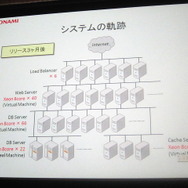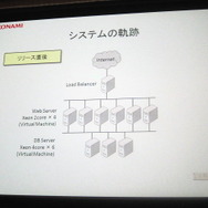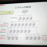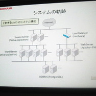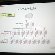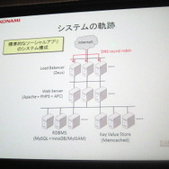 システム構成についても、一般的なソーシャルアプリと同じとのこと。インターネットからのアクセスに対して負荷分散を行い、その下にウェブサーバが連なり、最後にデータベースサーバやキャッシュサーバが連なる構成です。MMORPGの開発・運用ではネイティブアプリでセッションサーバ・ワールドサーバ・ウェブサーバが構築されていたこともありましたが、現在はすべてこの方式に統一されています。