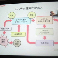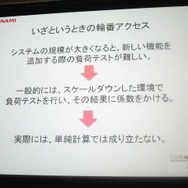 こうした中、コナミデジタルエンタテインメントで人気ゲーム『ドラゴンコレクション』のマネージャーを務める廣田竜平氏は、「大人気ソーシャルゲームを支える技術 ~拡大し続けるシステムの軌跡」と題して、その一端をあきらかにしました。2011年11月で550万人のユーザーを抱えるヒットタイトルの基盤技術だけあって、講演終了後もさまざまな質問が飛び出す人気セッションとなりました。
