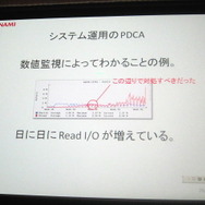 「障害はある一点を超えると一気に拡大します。そのため兆候を見逃さないことが重要です」(廣田氏)。講演ではサーバのアクセスに対する書き込み/読み込み頻度のグラフが紹介されました。書き込み頻度に対して読み込み頻度が徐々に増加し、両者が同じくらいになっています。本来はここで対処すべきでしたが、放置した結果、一気に読み込み頻度が増加し、障害に繋がってしまいました。