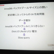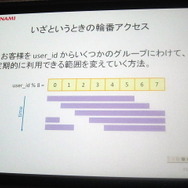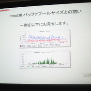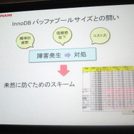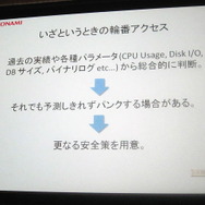 このほか「いざという時の輪番アクセス」というテクニックも紹介されました。一般的にシステムが増大化すると、新機能を追加する際の負荷テストが難しくなります。そこでスケールダウンした環境で負荷テストを行い、その結果に係数をかけるなどの処理が行われますが、実際には単純計算ではわりきれない障害が発生します。そうならないように、過去の実績やパラメータ(CPU Usage、ディスクI/O、データベースサイズ、バイナリログなど)から総合的に判断されるわけですが、それでもパンクしてしまうのが事実です。