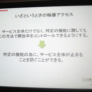 そこで当初からユーザーを複数のグループに分け、定期的に利用できる範囲を変えていく方法が考えられました(輪番停電にならって輪番アクセスと命名されました)。サービス全体に加えて、特定の機能に関しても、この方式で開放率をコントロールできるようにしておきます。これによって特定の機能障害でサービス全体が止まることを防ぐようにするわけです。「全体のアクセス数を抑えたいときに、処理を早い者勝ちにするよりも、不公平感がなくて実装が楽」だといいます。