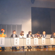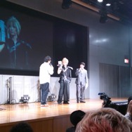 MCはアメリカザリガニ、審査員は、舞台上手からレベルファイブ社長の日野晃博さん、グラスホッパー・マニファクチュア社長の須田剛一さん、MAGES.社長の志倉千代丸さん、ガンバリオン社長の山倉千賀子さん、サイバーコネクトツー取締役の西川裕貴さん、エンターブレイン社長の浜村弘一さん、コスプレイヤーのコノミアキラさんです。会場はスモークが焚かれるなど、凝った演出もなされました。