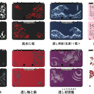 種類は、模様越しに3DS本体カラーが透けて見える「透し」バージョンを含めた、「散桜に兎」「流水に桜」「透し津波(北斎)<藍>」「透し金魚<桃>」「透し夜桜に流水」「透し梅と猫」「透し招雲龍」「透し朱椿」の全8種類。