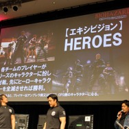プレス対抗のゲーム大会の前に、開発陣と後藤選手・棚橋選手によるエキシビジョンマッチがおこなわれました。HEROESモードに挑戦するも、開発者サイドからの容赦ない攻撃に何度も倒されてしまうことに。