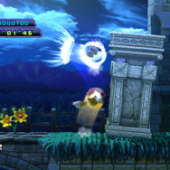 空中のタッグアクション。しっぽを回転させて空を飛ぶ「テイルス」に「ソニック」がつかまって飛行します。高い崖や奈落の底も、二人で協力して突破しましょう。
