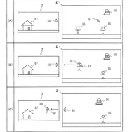特許によれば、Wiiリモコンを使い、テレビ画面からWii Uのタブレットコントローラーの画面にキャラクターをドラッグ&ドロップするようなことも可能のようです。出願に際しての図では、テレビ画面でUFOに襲われている人間をドラッグ&ドロップでWii Uの画面に避難させる様子が描かれています。