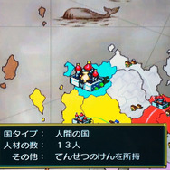 まず、自分の国の場所を自由に決定することができます。・・・って、アレ?「でんせつのけん」を所有している国も選択できちゃうようですよ(笑)。最初から「でんせつのけん」を持っているという状況は有利か不利か、すでに本作の魅力である「自由度」の高い選択が始まっているように感じますネ。筆者はこの状況に逆にビビってしまい、少し離れた大きめの国をチョイス。