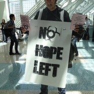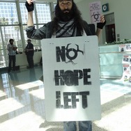 世紀末を臭わせる格好で「NO HOPE LEFT」と書かれた看板をぶら下げ「WHAT DO WE DO WHEN ALL IS LOST?(人類が滅亡したらあなたはどうする?)」とプリントされたビラを配っています。こちらはカプコンの『BIOHAZARD 6』に合わせたキャラクターのようです。