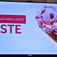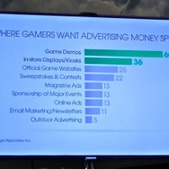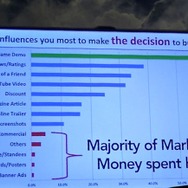 ペリー氏はまず、2万人のゲーマーを対象に行った調査結果を紹介しました。それによるとゲーマーの7割近くは、ゲームを買う上で一番参考になるものは体験版だと回答しているが、マーケティング費用の大半はテレビコマーシャルなどに費やされており、ユーザーはほとんど気に留めていないと回答。またゲーマーの6割は同じ広告予算を使うなら体験版や店内広告に使って欲しいと考えているといいます。