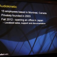 audiokineticはカナダのモントリオールに拠点を置く2003年設立の企業で、従業員は15人。その大半が開発者です。2006年にリリースしたサウンドのデザインツールとエンジンが一体となった「Wwise」の提供を中心にコンサルティングやトレーニングプログラムを提供しています。「Wwise」はこれまで20回以上のアップデートが繰り返され、日本企業を含む約200以上のタイトルで採用されてきました。