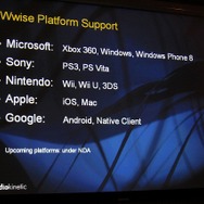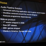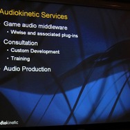 「Wwise」は現行の全ての家庭用ゲーム機とWii UそしてiOS/Androidなどのスマートフォンなど主要なプラットフォームを全てカバー。ゲームエンジンでは「Unreal Engine」「Unity」そして今回のGTMF2012に合わせてシリコンスタジオの「OROCHI」とのインテグレーションが提供されることも明らかになりました。価格はタイトルの予算に応じて変わってくるとのこと。