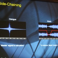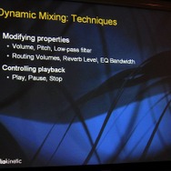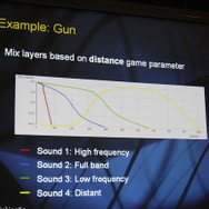 デモではスノーボードのジャンプや着地によってオーディオを変更したり、銃声をその聞く距離や方向によってボリュームやフィルタのパラメーターを変化させて音を変えるといった事が紹介されました。この「ダイナミックミキシング」ではゲームのサウンドをよりインタラクティブに変えることができるようになります。