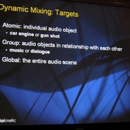 「ダイナミックミキシング」には3つのスコープが存在します。「オーディオオブジェクト」(単位)「グループ」「グローバル」(全体)です。グローバルでミキシングを行えば、プレイヤーが水に潜ったような表現や、一時的に能力が変化するといった表現が容易に可能です。