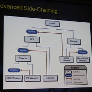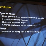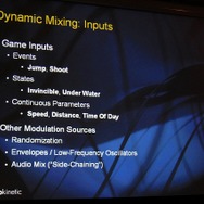 今回のセッションで特に強調されたのは「ダイナミックミキシング」というフィーチャーです。これはゲームの状況に応じてオーディオのミックスを変更するというもので、これを活用することでユーザーが常に同じ音楽を聞くことを防ぎ、リアル感や没入感を与え、かつ何が重要であるかを音楽で感じ取らせることができるとリードソフトウェアエンジニアのMartin Dufour氏は語りました。