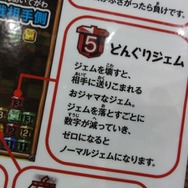 どんどんジェムを消す2人。しかし、『アイルーでパズルー』は少し変わったパズルゲームだった。とにかくジェムを消しまくってフィールドがスッキリしていればいいというタイプではなく、いかにジェムを連結させて放置し爆弾ジェムで一気に破壊するかが攻撃力を決める。なので、フィールドがみっちりしてヤバイと焦ることは焦るのだが、戦いの陣をしいておけば1つの爆弾ジェムで形勢逆転できるところがかなりアツい。実際それに気付き始めてからというもの、対戦相手とはのこり3ラインのところで必ず相手に報復するような勝負を繰り広げており、コップに注がれたジュースをカラのコップに移し変えることを繰り返しているような対戦となった。普段は「あっ、○○来ましたよ~!」とやんわりアドバイスするスタッフのお姉さんは残り1ラインで復帰する私たちをひたすら見守り、時に「ああっ!」と驚きの声を漏らしていた。1戦目は私が負けてしまったけれど、ガチ対戦が出来たことが嬉しくて楽しくてしょうがなかった。