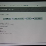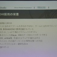 バイキングの尾畑氏が特に強調したゲームエンジンの条件は「ゲームエンジンに合わせてゲームを作るのではなく、ゲームに合わせてエンジンをカスタマイズできること」。実在の街を舞台にして、写実的なグラフィックやエフェクトを多様するという点で「YEBIS」「BISHAMON」などが最初から使えること、シリコンスタジオがレンダリングを非常に得意としたスタジオであり「わがままも叶えて貰えそう」な点も大きなポイントとなったそうです。また、タイトーから提供されるガンコンのライブラリなどを柔軟に組み込める点も重要でした。