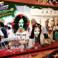 フキダシステムが開発した「カオダシステム」は、カメラで認識した顔をスクリーン(映像表示装置)の中に取り込んでしまうサイネージシステムです。今回の出展では、通りがかった人の顔を認識すると『ロリポップチェーンソー』に登場するボスゾンビ、雑魚ゾンビがランダムに登場する仕組みで公開されています。