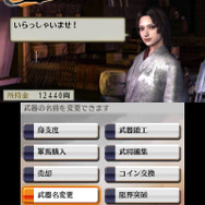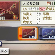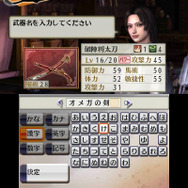 本作からの新機能として、すれちがい通信で配信した武器が自分が鍛えたものだということが分かるように、武器作成者が武器名を変更できるようになりました。画面写真では「破陣将太刀」を「オメガの剣」に変更。漢字入力も可能です。「よろずや」で設定できるようになります。