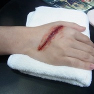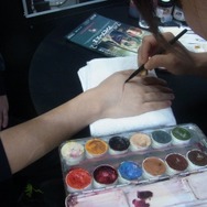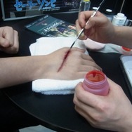 そこで実際に筆者がこれにチャレンジ、手の甲に傷のゾンビメイクをほどこしてもらった。出来のよさはかなりのもの。あまりの傷のリアルさに、少々めまいがし、なんだか不安になってくる。メイク希望者は、心を強くしてのぞもう。