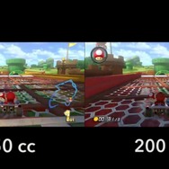 先日「ドルフィンみさき」の比較動画をお届けしましたが、こちらの動画でもキャラクターとマシン、コースは同じ。比較となるのは一周あたりのゴールタイムです。コースは「3DSパックンスライダー」ですが、今回は150ccが一周約54秒のところを200ccは約40秒程と、14秒程の差をつける結果となっています。