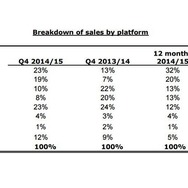 また、同社は2013/14、2014/15の通年およびホリデーシーズン含むQ4の機種別販売率も発表しました。2013年度Q4期ではPS3/Xbox 360向け販売の合計が全体の42%を占めていましたが、2014年度Q4期においてはXbox 360が10%、PS3が8%にまで低下しており、PS4/Xbox Oneの普及がより感じられるのではないでしょうか。