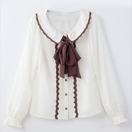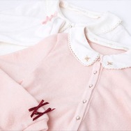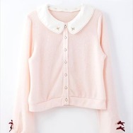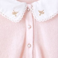 襟付きカーディガンは、襟元にまどかの武器である弓とバラをモチーフにしたデザインを刺繍した。背面に刺繍で描かれたさ「Don’t tell anyone in class, okay?」は、名セリフ「クラスのみんなには内緒だよ」を英訳したものだ。襟は取り外しも可能で、価格は7,400円(税別)となっている。