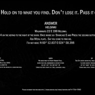 Valveがアクションパズルゲーム『Portal 2』のリリースに向けて行ったARGです。まず最初の段階として本作の正式発表前の2010年3月に、前作『Portal』にていくつかのARGを実施。ゲーム内のラジオを特定の場所に持って行くと、画像に変換可能な音声データが取得できた他、専用ソフトと56KモデムのみでアクセスできるBBSにて『Portal 2』発表日が示唆されたりしました。また、アップデートによって『Portal』のエンディングも若干変化しています。