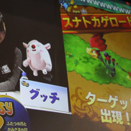 マルチプレイは4人まで。3DSよりも1人増えました。施設を建設するための素材はマルチクエストで集めます。会場では実機にてデモプレイが披露されました。日野氏も王国兵士として参戦。また、人気ゲーム実況者のアブ氏も傭兵として参戦しました。