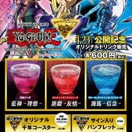 今回発表されたのは、ティ・ジョイ系列の公開劇場で販売されるオリジナルドリンクの数々。ドリンクの種類は、武藤遊戯、海馬瀬人、藍神の3人のキャラクターをイメージした配色の3種類だ。