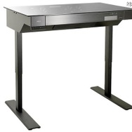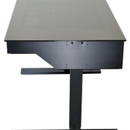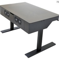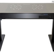 おそらく光学ドライブ用の5インチベイと、8つもの3.5インチベイを用意している。右手前には本体の高さが調整可能なボタンが搭載されており、116cmまで好みの高さにデスクを調整可能だ。デスク上からは内部の様子が確認できる。PC本体をデスクの中に収めてしまう、いわばPC内蔵デスクが手に入る。
