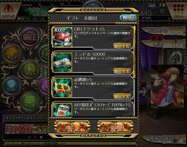 まずはOBTの参加報酬を受け取り、ゲームの簡単な説明を受けたあとは、上の抗争ボタンをクリックして、チュートリアルをスタートします。チュートリアルは、チューター役「御門日向」との連携攻撃などを覚えつつ、奥義や回復など、説明に合わせてボタンを押していくだけの手軽な作り。ポイントを大まかにまとめると、「連携は強い」「回復は大事」「奥義は発動に時間がかかるものの超強力」という認識で良さそうです。なお、抗争は最初に説明されますが、行えるのは指定された時間のみなので、通常のストーリー部分では使わないシステムである点に注意が必要です。