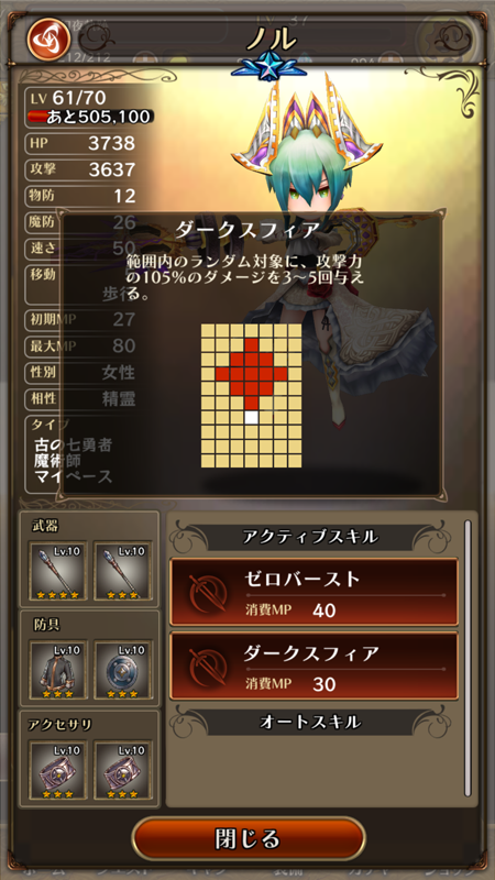 ノルはアタッカートップクラスの攻撃力を誇っています。能力解放してMPを増やせば1ターン目から放てる範囲内のランダム対象に複数回攻撃するアクティブスキル「ダークスフィア」の破壊力は敵からすれば“凶悪”の一言です。ノルがいるだけでバトルがどれだけ楽になることか。もう一つのアクティブスキル「ゼロバースト」と合わせて広範囲で、複数・単体のどちらにも応用が効きます(どちらも覚醒後の名称)。ただし、「グラビトンバースト」は強力な反面、味方にもダメージを与えてしまうので陣形を計算してキャラクターを動かしましょう。